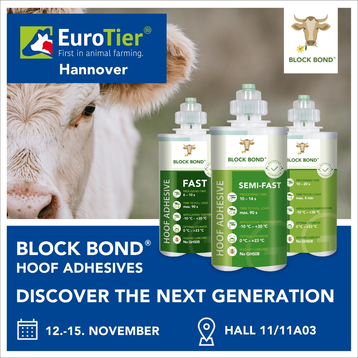 Unsere GLUETEC-Klebstoffexperten stehen Ihnen zur Seite, um Sie über den optimalen Einsatz von Klebstoffen im Veterinärbereich zu beraten. Zudem möchten wir Ihnen die Vorzüge des neuen SEMI-FAST Klebstoffes der Marke BLOCK BOND® näher vorstellen. BLOCK BOND® bietet spezielle Klebstofflösungen, die eine zuverlässige Befestigung und hohe Festigkeit bei der Klauenpflege gewährleisten und somit zur Gesundheit und Leistungsfähigkeit Ihrer Nutztiere beitragen. Unser Berater Semir Fetahovic unterstützt Sie dabei, die richtigen Klebstoffe für Ihre spezifischen Anwendungen auszuwählen.